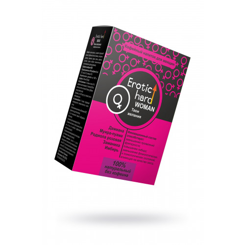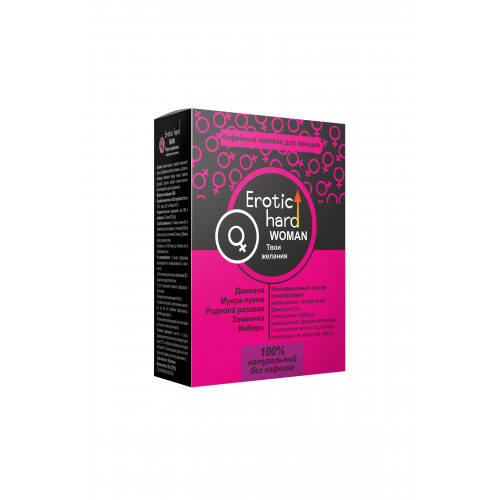 Кофейный напиток Erotic hard «WOMAN. Твои желания» с растительными экстрактами — это 100% натуральный продукт. Рекомендуется женщинам в любом возрасте для того, чтобы разбудить сексуальное желание, для повышения либидо, уменьшения проявлений фригидности, уменьшения физиологических и психологических состояний, влияющих на качество секса, а также в качестве источника, минералов, микроэлементов, антиоксидантов, аминокислот, фитонутриентов для поддержания сексуальной функции, гормонального баланса, увеличения энергии, выносливости, продления молодости. Входящие в состав алкалоиды, β-ситостерол и эфирные масла способствуют улучшению кровообращения в органах малого таза, усилению сексуального возбуждения, уменьшению симптомов климакса и ПМС, замедлению процессов старения клеток. Кофейный напиток благодаря своему составу оказывает положительное воздействие не только на мочеполовую, но и на центральную нервную, сердечно-сосудистую и эндокринную системы, что способствует общему омоложению организма. 5 растительных