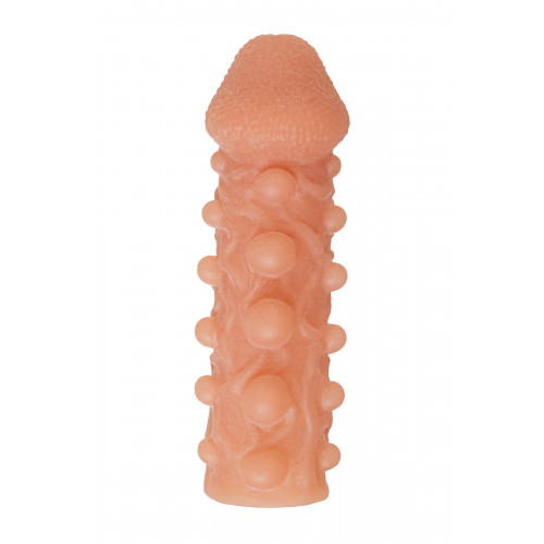 Увеличивающая насадка с фантазийным рельефом от KOKOS открывает новые возможности для взаимного удовольствия и воплощает фантазии о внушительном размере пениса. Увеличенный размер и объем полового члена добавляет мужчине уверенности в своих сексуальных возможностях. Дополнительная стимуляция партнерши для яркого и насыщенного оргазма. Увеличение продолжительности полового акта у мужчины - задержка эякуляции, и наращивание темпа приближения оргазма у женщины. Реалистичная насадка на пенис - необходимый элемент для вашей сексуальной игры, если вы хотите максимально удовлетворить свою партнершу и сделать ваш секс незабываемым. Благодаря значительному размеру мощной головки, зона G и вход во влагалище получают усиленную стимуляцию. Особенный рельеф в виде мягких шариков разных размеров и многочисленных вен по всему стволу насадки деликатно ласкает чувствительные зоны. Размер: длина 15,6 см, диаметр 4,2 см.