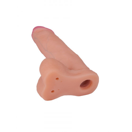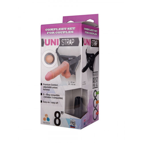 Фаллоимитатор телесного цвета изготовлен из неоскина - материала, в точности имитирующего кожу человека и делающего ощущения максимально пикантными и реалистичными. Второй - из ПВХ. Длина телесной насадки - 20 см., рабочая длина - 18 см., диаметр - 4,8 см.