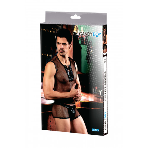 Эластичная майка-сетка с имитацией шнуровки и отделкой wetlook. Трусы-боксеры в комплекте. Вид сзади эротично подчеркивает ложбинку ягодиц.