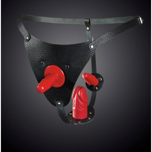 Трусики изготовлены из натуральной кожи. При производстве используется никелированная фурнитура. Размер регулируется ремешками, которые крепятся на бёдрах (от 42 до 50 размера). В комплект входит съёмный пластиковый плаг для насадок, съёмный фаллоимитатор, а также съёмная анальная пробка. Подходит для использования как мужчиной, так и женщиной. Длина съемного фаллоимитатора - 8 см., диаметр - 3,5 см.
