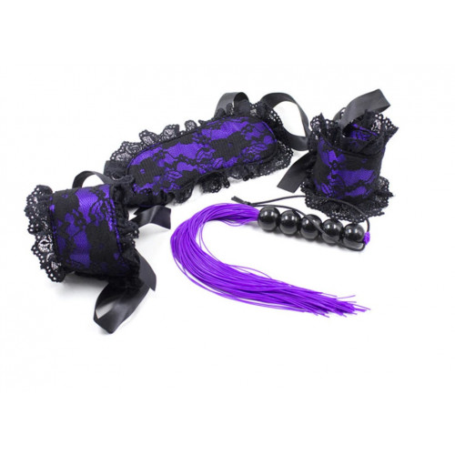 Необычайно красивый кружевной набор - прекрасный подарок для новичков! Мягкая маска сделает Ваши ощущения ярче, так как Вы не сможете видеть происходящее. Манжеты на запястья на завязках обеспечат максимально комфортное использование. Флоггер с изящной ручкой гарантирует Вам множество незабываемых впечатлений. Цвет фиолетовый+черный.