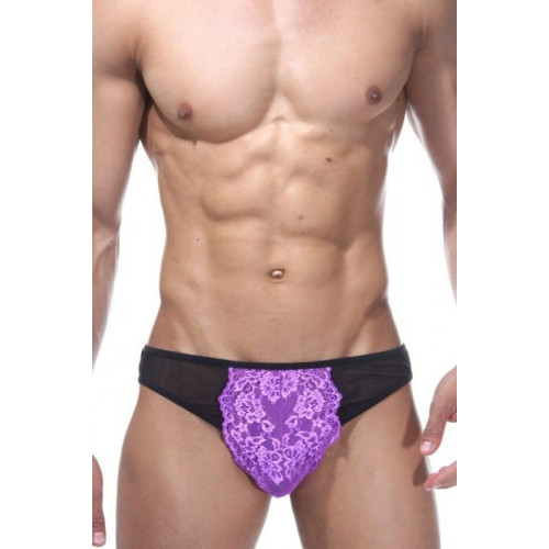 Черно-фиолетовые слипы для мужчин с низкой посадкой. На ягодицах и по бокам полупрозрачная черная тонкая ткань, а спереди яркая фиолетовая вставка из кружева.