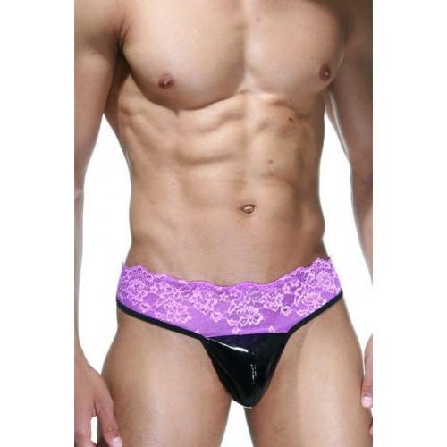 Трусы-танга двухцветные, в которых скомбинированы кружевной ярко-фиолетовый пояс и кружевная задняя часть трусов с лаковым гладким блестящим черным материалом в районе мошонки.