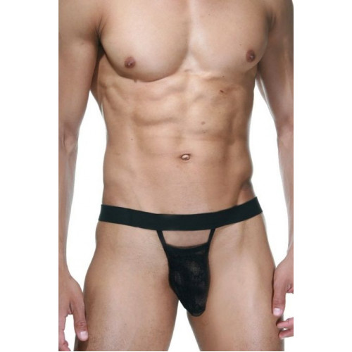 Черные мужские стринги на широком поясе, гульфик из полупрозрачной черной ткани.