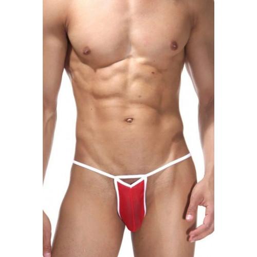 Небольшие мужские стринги из красного материала в мелкую сетку, на тонких белых резинках.