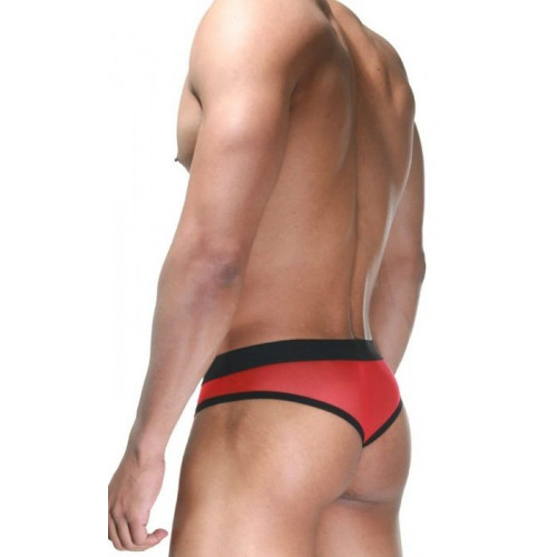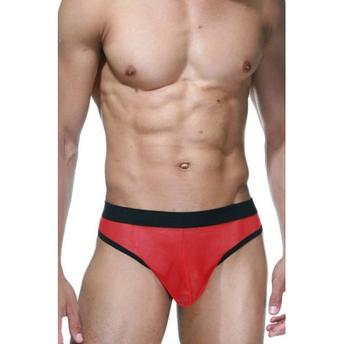 Мужские тонги из красной полупрозрачной ткани, с черным кантом и на широком черном поясе.