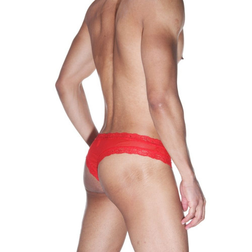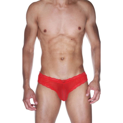 Красные мужские бразилиана из полупрозрачного легкого тянущегося материала. Кант из кружевной красной ленты.