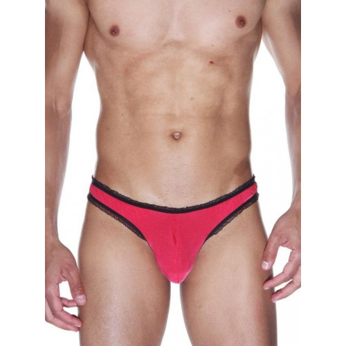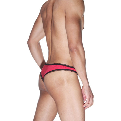 Красные мужские трусы-бразилиана с черной рюшевой отделкой