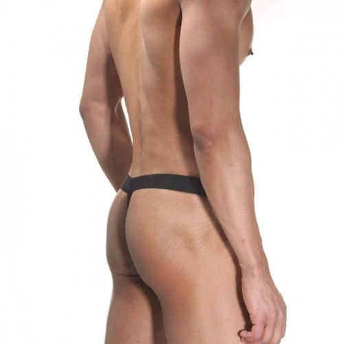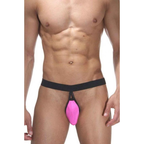 Мужские трусы-стринги на широкой черной резинке, с ярким розовым гладким гульфиком.