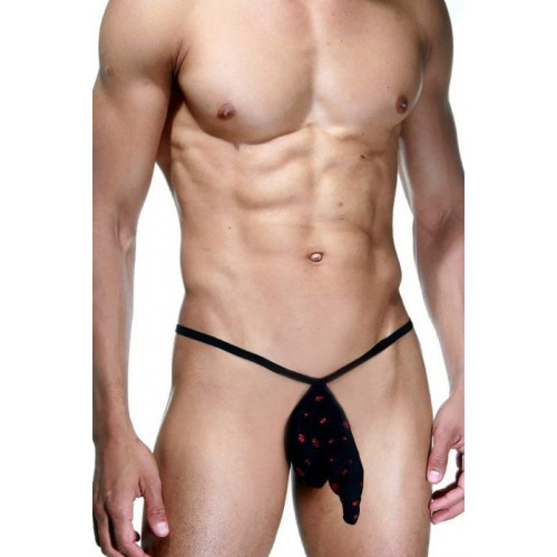 Черные стринги-мешочек на тонких черных резинках. На тонкой мягкой черной ткани красные вкрапления рисунка.