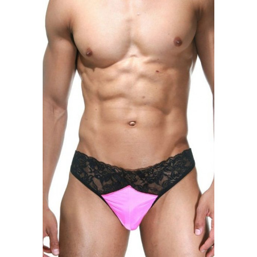 Танга для мужчин, с кружевным полотном на ягодицах и поясом, и розовым, эластичным материалом в районе мошонки.