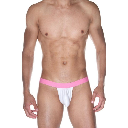 Мужские трусы-джоки на розовом поясе, с розовыми переплетенными широкими полосами-резинками на ягодицах и белым гладким гульфиком.