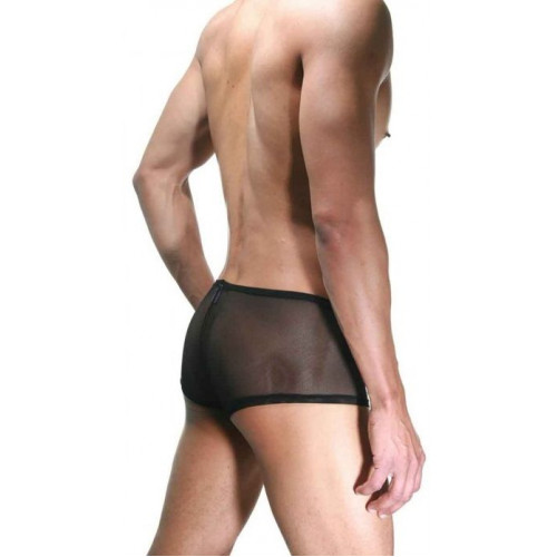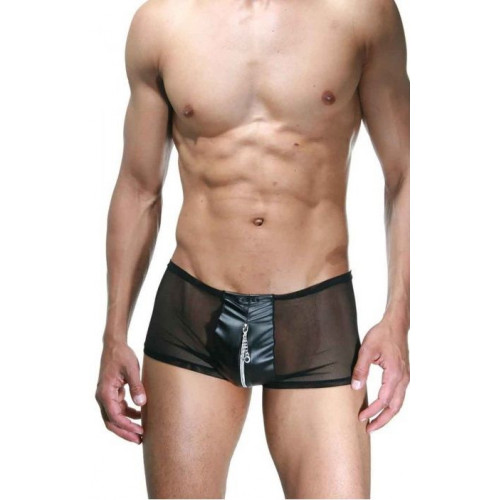Мужские трусы-хипсы из гладкого материала, имеющие спереди гладкую вставку с молнией. По бокам и на ягодицах использована полупрозрачная ткань.