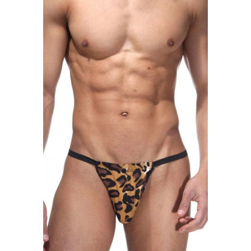 Трусы-стринги с леопардовым мешочком-гульфиком, на толстой черной резинке на поясе. Ягодицы полностью открыты.