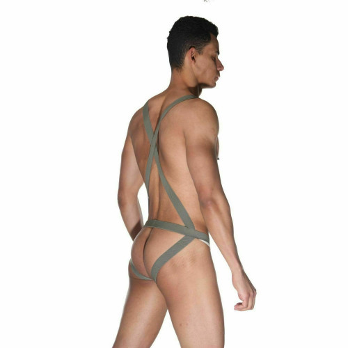 Оригинальное боди с трусами-джоки для мужчин. Трусы белого цвета из тонкой эластичной ткани, а верхняя часть боди и зад выполнены из серых широких тянущихся ремней.
