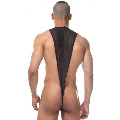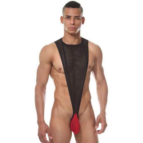 Оригинальное боди для мужчин, в котором скомбинирована верхняя полупрозрачная с контрастным гульфиком.