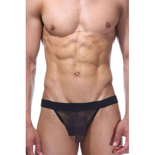 Мужские трусы из полупрозрачной ткани, с интимным вырезом спереди, на широкой резинке. Сзади трусы имеют оригинальный дизайн из тонких резиночек.