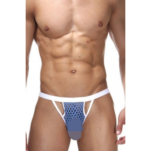 Мужские откровенные трусы в крупную синюю сетку. Трусы-стринги, на широкой белой резинке.