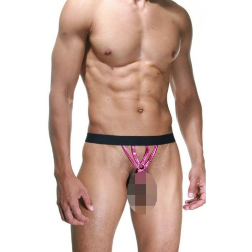 Очень откровенные трусы, на широком черном поясе, из розовых ремешков, с полностью открытыми ягодицами и гениталиями.