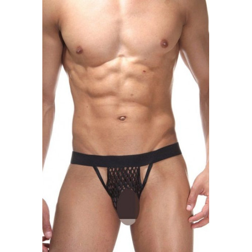 Мужские откровенные трусы в крупную черную сетку. Трусы-стринги, на широкой черной резинке.
