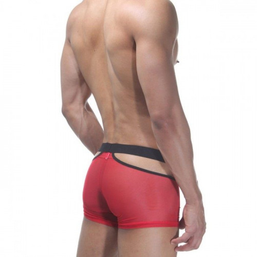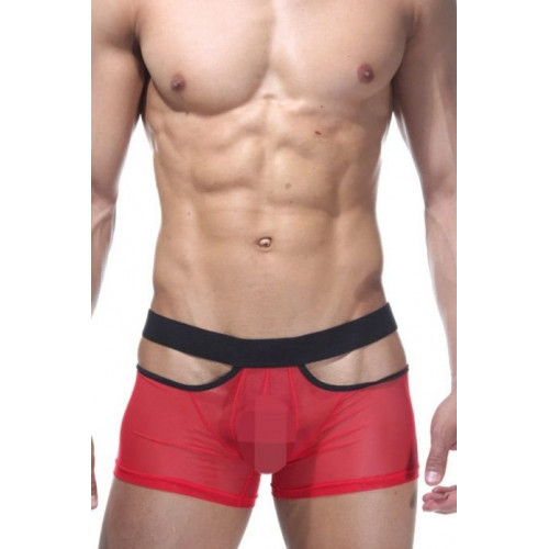 Откровенные трусы-боксеры из красной полупрозрачной ткани, с вырезом на интимном месте. Трусы на широкой черной резинке, с двумя небольшими вырезами по бокам.