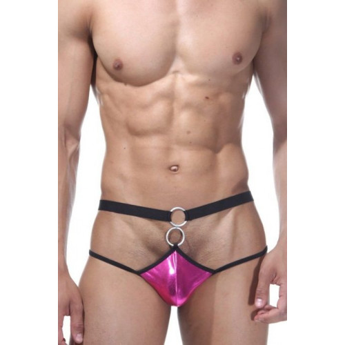 Мужские трусы-джоки из розовой блестящей ткани, на черных резинках, с декором из двух металлических колец.