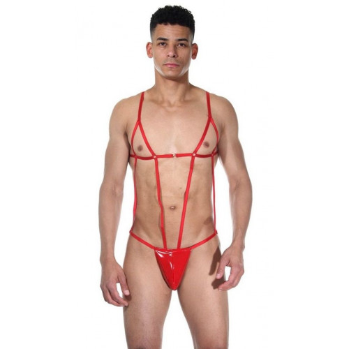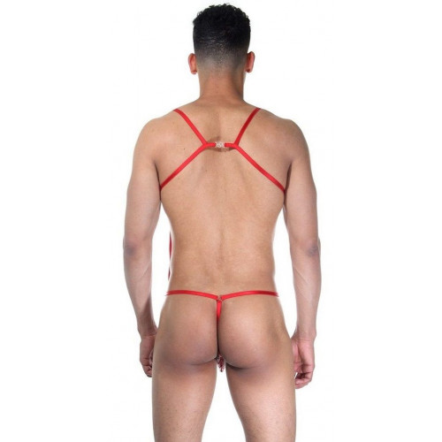 Мужское боди красного цвета из плотной гладкой ткани. Трусы-стринги, по телу спереди и сзади комплект ремешков.