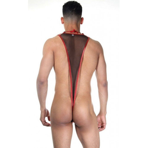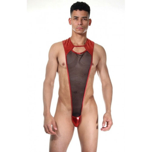 Интересное боди для мужчин, сшитое из двух видов ткани: черной полупрозрачной тонкой сетки и блестящего красного гладкого материала на плечах и в интимной зоне.