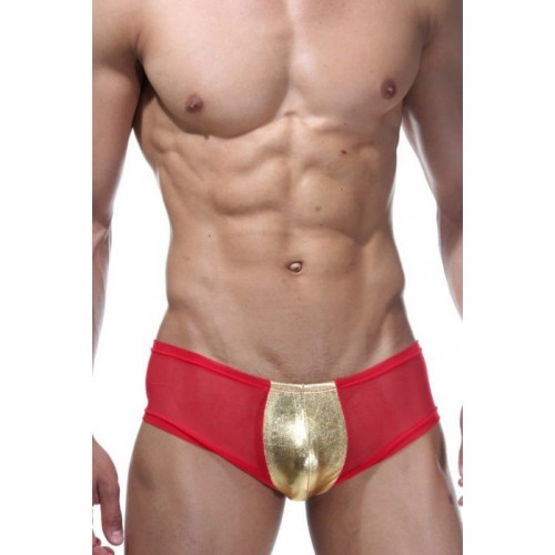Трусы-хипсы мужские с низкой посадкой. Сшиты из красной полупрозрачной хорошо-тянущейся ткани, спереди вставка из золотой ткани.