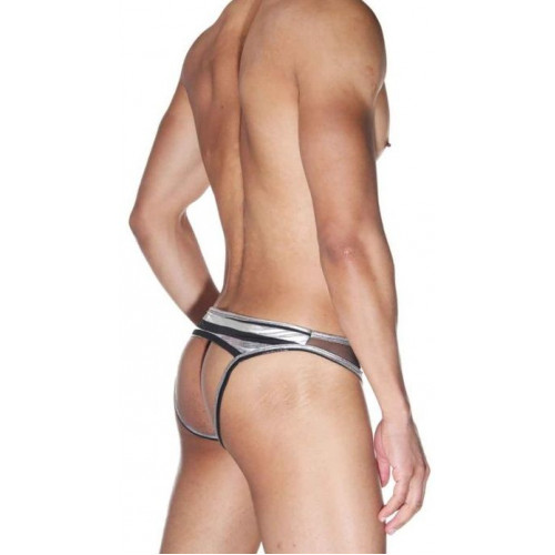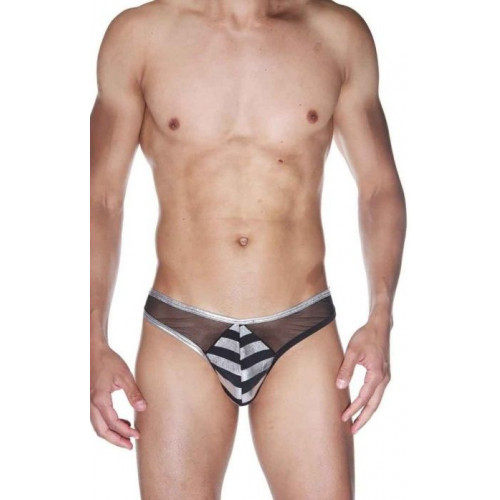Трусы-джоки для мужчин, сделаны из комбинации двух типов ткани - полупрозрачной и гладкой в полоску. Ягодицы полностью открыты.