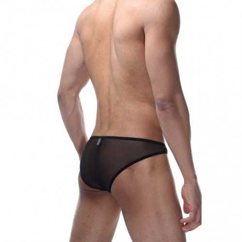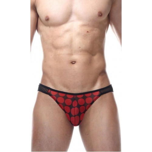Мужские трусы-слипы, спереди из ткани в крупный красный горох, сзади из черной полупрозрачной легкой ткани.