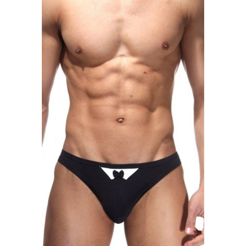 Классические трусы-стринги черного цвета. Спереди небольшая вставка белого цвета и маленький черный бант.