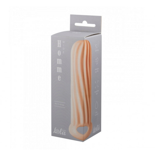 Насадка Wide коллекции Homme обеспечивает увеличение размера пениса в ширину. Материал насадки - гипоаллергенный, создающий имитацию мягкой и шелковистой кожи ТПЕ. Фиксирующее кольцо на мошонку не только удерживает фаллоудлинитель, но и благодаря сдавливанию может усиливать эрекцию. Двухсторонний нереалистичный рельеф насадки позволит одновременно стимулировать сразу обоих партнеров во время полового акта и дополнительно подарит приятные ощущения. Благодаря толстым стенкам, насадка увеличивает диаметр пениса до 1,5 см. Насадка отлично тянется, продлевает время интимной близости и компенсирует анатомическое несоответствие между партнерами Материал ТПЕ. Размер: длина 13 см, длина внутреннего тоннеля 12,5 см, внешний диаметр 3,8 см, толщина стенки 7 мм. Цвет бежевый. Для более комфортного использования рекомендуем смазку на водной основе и очищающий спрей Clear Toy 100 мл.