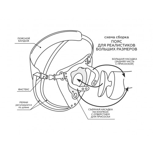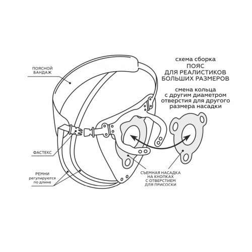Пояс способен выдержать самый «солидный» размер насадки. Для этого проденьте насадку с присоской в отверстие. Присоска, соприкасаясь с телом, способна амортизировать нагрузки и даже присасываться к телу, дополнительно фиксируя изделие. В зависимости от размера снимите или оставьте съемное кольцо. И отрегулируйте «хомутик» с помощью кнопок для изменения диаметра по насадке-реалистику. Такой пояс можно использовать в очень широком диапазоне размеров.