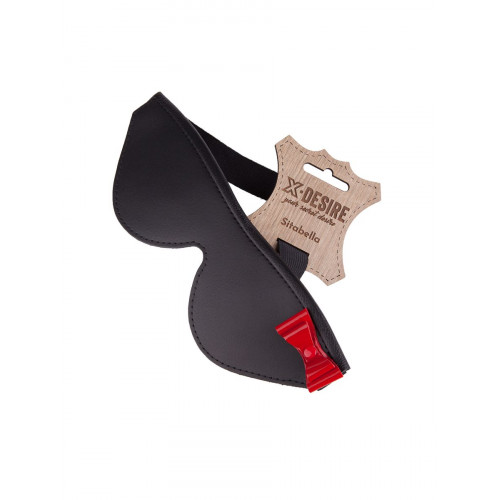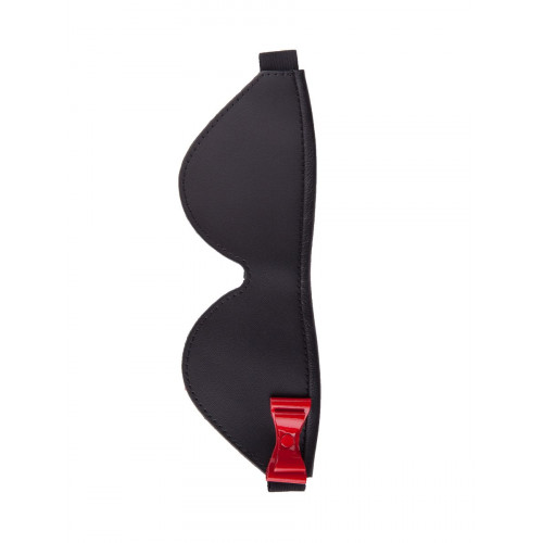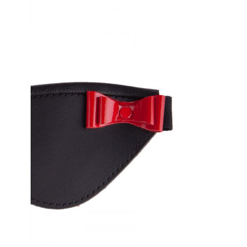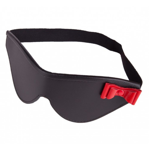Маска на глаза закрытого типа из натуральной кожи черного цвета, украшенная красным лаковым бантом. Фиксирующая резинка позволяет легко регулировать размер изделия. Внутренняя часть имеет подкладку из велюровой бархатистой кожи. Ширина - 7 см.
