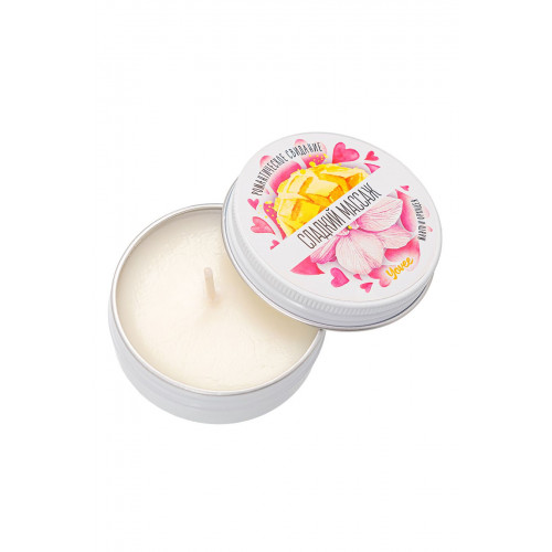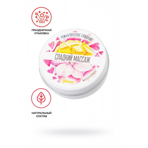 Массажная свеча Yovee «Сладкий массаж» с ароматом «Манго и орхидея» - изысканный аксессуар для романтического свидания. Изготовлена из натуральных масел, которые питают, увлажняют, смягчают кожу и делают её шелковистой. Небанальный сладкий аромат манго и орхидеи остается легким шлейфом, напоминая о проведенных минутах блаженства. Благодаря праздничному дизайну упаковки свеча отлично подходит в качестве презента. Основа свечи - гидрогенизированное соевое масло, которое идеально смешивается с уходовыми маслами и отдушкой, а при комнатной температуре приобретает плотность воска. При горении свечи твердый воск расплавляется в тёплое массажное масло, не обжигающее кожу. Уходовые масла: пальмовое, кокосовое и масло виноградной косточки - многофункциональны. Пальмовое масло помогает справиться с авитаминозом кожи, дарит приятное увлажнение и свежесть, смягчает огрубевшую и шелушащуюся кожу, помогает справиться с возрастными изменениями. Кокосовое масло придает коже бархатистость, защищает, смягчает, разглаживает.