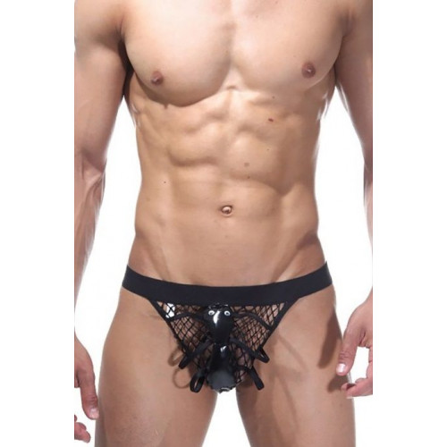 Мужские шуточно-ролевые трусы-стринги. Спереди крупная сетка, на которой сидит черный паук с белыми глазами. Трусы на широкой резинке, с низкой посадкой.