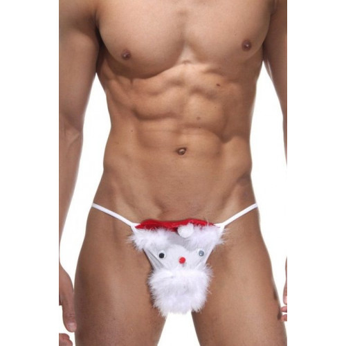 Трусы-стринги белого цвета, на тонких резинках. Спереди Санта Клаус, с белой бородой, глазами и в красном колпаке.