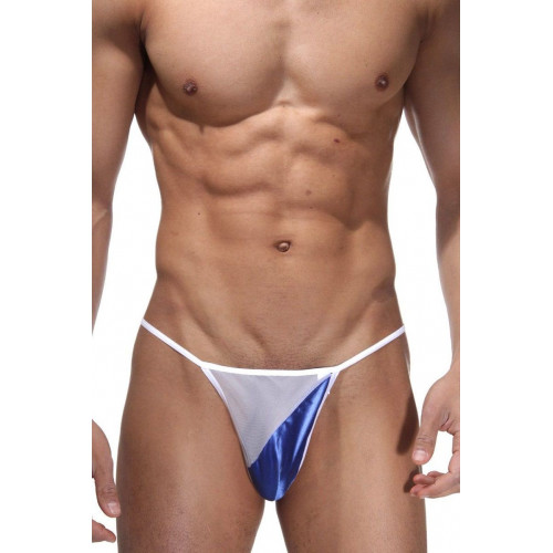 Необычные стринги для мужчин на тонких резинках. Спереди диагональная синяя блестящая вставка.