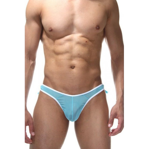 Голубые трусы-тонги из полупрозрачной тонкой сетчатой ткани, с белым кантом. Сзади бахрома, окаймляющая ягодицы.