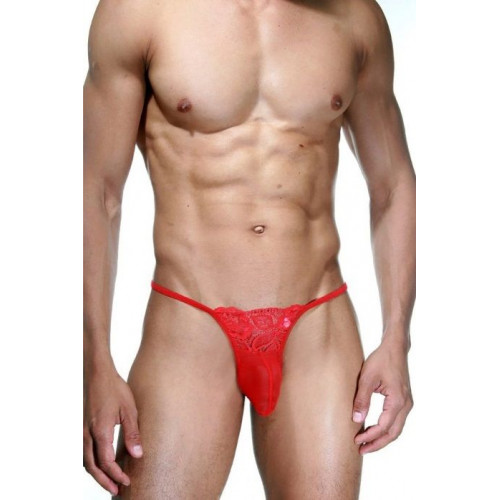 Тонкие стринги красного цвета из полупрозрачной сетки и кружев.