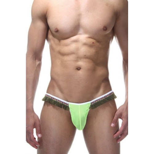 Танга для мужчин сочного ярко-зеленого цвета. Трусы на тонкой белой резинке, по бокам которой пришита темно-зеленая бахрома.