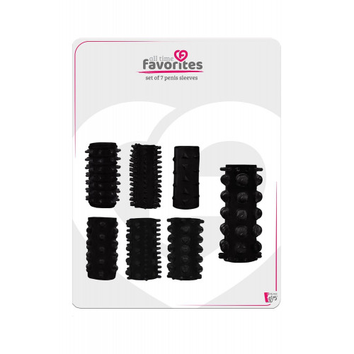 Этот набор из 7 насадок для пениса имеет 7 различных текстур. Они эластичны и из-за их плотной посадки работают как кольцо для пениса для более жесткой и продолжительной эрекции, а текстура стимулирует ее во время полового акта.
