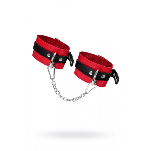 Мягкие Оковы с жёсткими ремешками помогут обездвижить партнера во время сексуальных прелюдий или жестких БДСМ-играх. Оковы изготовлены полностью из красной, натуральной кожи. Ремешки выполнены из чёрной жёсткой кожи, украшены люверсами. Выделка материала произведена вручную. Ремешки и широкая манжета хорошо держат форму: не тянутся и не мнутся. Качественная металлическая фурнитура добавляет лоска изделию, а аромат натуральной кожи повышает градус возбуждения. Благодаря широкому запасу регулировок, можно подобрать необходимый обхват. Аксессуар удобно застегивать и легко расстегивать. При правильном использовании не оставляет следов на теле и не доставляет дискомфорта. Манжеты оков соединяется между собой помощью двух карабинов и съемной стальной цепочки. Подходит и для женских, и для мужских ног. Натуральная кожа. Ручная работа. Износостойкий, тактильно приятный материал. Надежная высококачественная фурнитура. Универсальный размер. Ширина манжет 5,5см. Длина манжет 25 см.