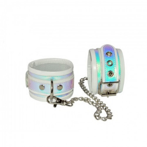 Потрясающе эффектные оковы от Sitabella,из натуральной кожи с декоративной голграфической отделкой из искусственной кожи, окунут Вас в безграничный и эпатажный мир BDSM. Изготовлены оковы из натуральной высококачественной кожи белого цвета. Подогнать изделие по размеру можно при помощи пряжек. Для соединения оков используется цепочка с карабином, который крепится к полукольцам. Вся металлическая фурнитура имеет никелевое покрытие. Длина оков с цепью 54 см, ширина 5,2 см.