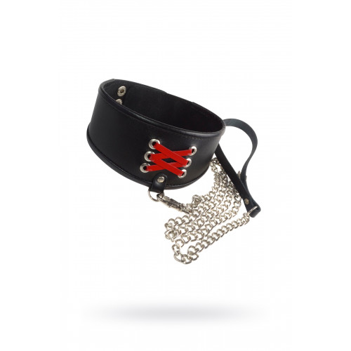 Для любителей ролевых игр Ситабелла представляет широкий ошейник из натуральной кожи. Высококачественный материал, из которого изготовлен девайс, гарантирует комфортное и долгосрочное использование.Лицевая сторона из чёрной кожи в сочетании с переплётом из красных лаковых лент, напоминает корсет, который плотно обхватит шею Вашего партнёра. Для комфортного ношения, изделие имеет подкладку и обработанный оторочкой край по всему периметру ошейника. Эргономичность изделия основана, на том, что ошейник более широкий спереди, но сужается к зоне крепления, это не ограничивает движение. Длина ошейника составляет 43 см, максимальная ширина 7 см. Зафиксировать на шее и отрегулировать размер можно при помощи кнопок. В паре с ошейником идёт поводок-цепочка, что позволит держать партнёра на необходимом расстоянии. С одной стороны цепочки располагается карабин для крепления к ошейнику, с другой, кожаный ремешок-петля, который для удобства можно разместить на запястье. Общая длина поводка около 1 м.
