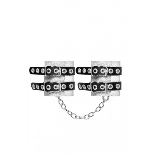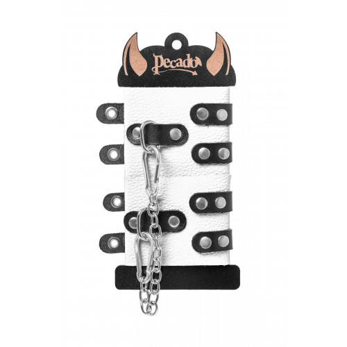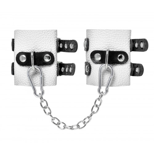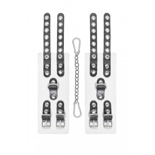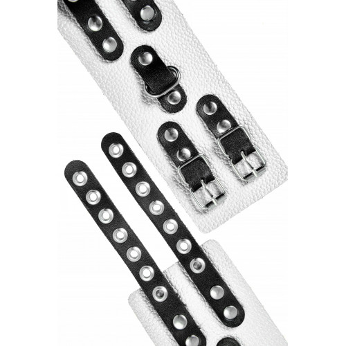 Основатели бренда уверены: лучший способ избавиться от искушения - поддаться ему! Мягкие, белые, кожаные наручники с двумя чёрными, жёсткими ремнями могут стать стильным аксессуаром, а могут послужить вашим целям по своему прямому назначению. Частичное обездвиживание и невозможность двигать руками дают вам полную власть над партнером – взрослые игры для взрослых. Наличие двух колец и карабинов, соединенных между собой металлической цепочкой, позволяет использовать изделие как раздельно – аксессуар-манжеты, так и как наручники для фиксации. К широким металлическим кольцам также можно присоединить и другие аксессуары при помощи карабинов. Благодаря универсальному размеру наручники могут использоваться и мужчинами, и женщинами. Длина манжет - 18 см, ширина - 7 см.