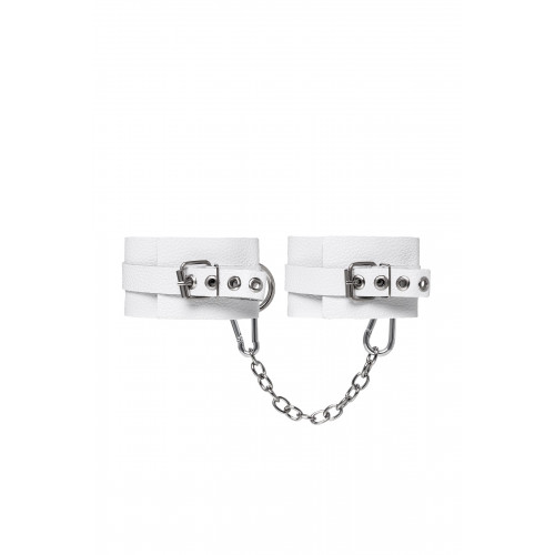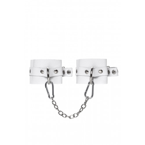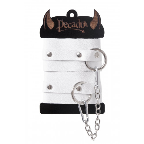 Самый мягкие оковы из всей линейки российского производителя Pecado. Сексуальный атрибут изготовлен из безопасной и натуральной кожи. Насыщенно белый цвет и терпкий аромат материала повышают градус возбуждения в процессе ролевых игр. Манжеты и ремешки девайся очень тактильно приятные. Они не мнутся, не тянутся и обладают повышенной износостойкостью. Вся фурнитура высокого качества. На тонких ремешках имеются отверстия с люверсами, для подбора нужного обхвата. Благодаря стальной застежке аксессуар легко застегивается и расстегивается. Между собой оковы присоединяются с помощью карабинов и короткой цепочки. Длина манжет – 25 см, ширина - 5,5 см.