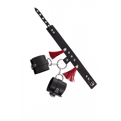 Бондажная система для фиксации рук и поддержки ног состоит из ошейника, пары фиксаторов для ног и пары наручников с контрастной строчкой красного цвета, всё это в фирменной деревянной коробке Pecado. Кожаный ошейник соединяется с наручниками с помощью кольца и металлических карабинов. Фиксаторы для ног крепятся к кольцу ошейника металлическими цепочками с карабином. Кольцо на ошейнике позволит присоединить и другие аксессуары при помощи карабинов и экспериментировать с позициями и ощущениями. С этим комплектом расширить возможности и способы фиксации проще простого! Варианты и комбинации ограничения свободы партнера зависят от вашей фантазии и желаний. Частичное обездвиживание и невозможность двигать руками дают вам полную власть над партнером – взрослые игры для взрослых.